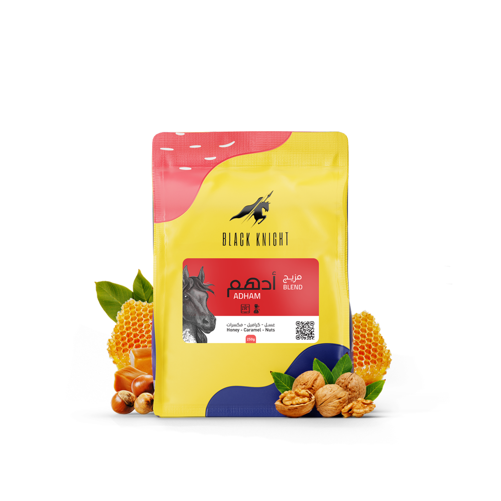 مزيج أدهم من منتجات محمصة بلاك نايت (الفارس الاسود) الذي لاقى استحسان أغلب رواد القهوة المختصة وحقق انتشار على نطاق واسع المزيج بطابع فريد وفاكهية لطيفة أقرب إلى طابع الكلاسيك.
